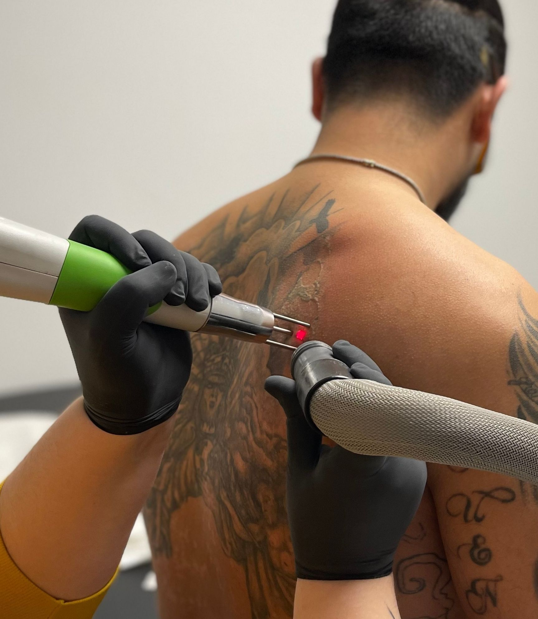 Most tattoos need 6–10+ sessions spaced 6–8 weeks apart, depending on ink colors, depth, age, and your skin’s response.